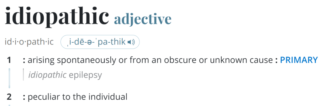 If I sat here and thought long and hard, I’m sure I could come up with several more frustrating things than going to the doctor and hearing that this thing that is making you miserable is “idiopathic”. It would take some time, but I’m creative and pessimistic so I’m pretty sure I could come up with something.