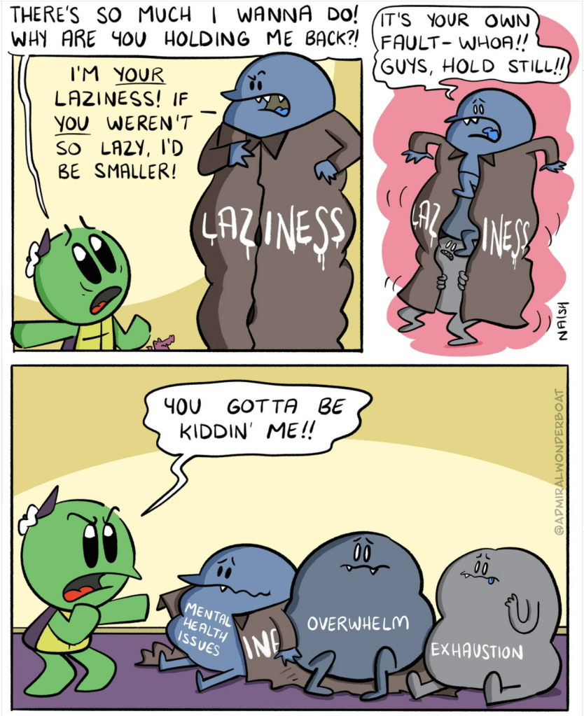 • Try to figure out what the real problem is–what is the actual obstacle? Does your child refuse to vacuum their room because the sound of the vacuum hurts their ears? Are they avoiding doing homework because they don’t understand the instructions? Is your child embarrassed that they dropped their violin rosin in the toilet and that’s why they won’t practice? Is their need for autonomy being overcome by their fear of failure?  Sometimes laziness is really just mental health issues, feeling overwhelmed, and exhaustion wearing a trench coat. (See comic by Admiral Wonderboat on Instagram https://www.instagram.com/p/ChSCthvB1cK/)